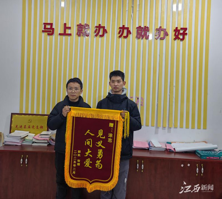 江西新闻客户端讯(江西日报全媒体记者侯艺松通讯员罗晨颖)“你是我们全家的大恩人!要不是你,真不敢想象我父亲会怎样……”近日,在南昌县银三角街道涂家村村委会内,莲塘街道定岗村村民郭大爷的儿子郭凯将一面印有“见义勇为、人间大爱”的锦旗送到“95后”现役军人涂志手中,感谢他救了自己落水的父亲。